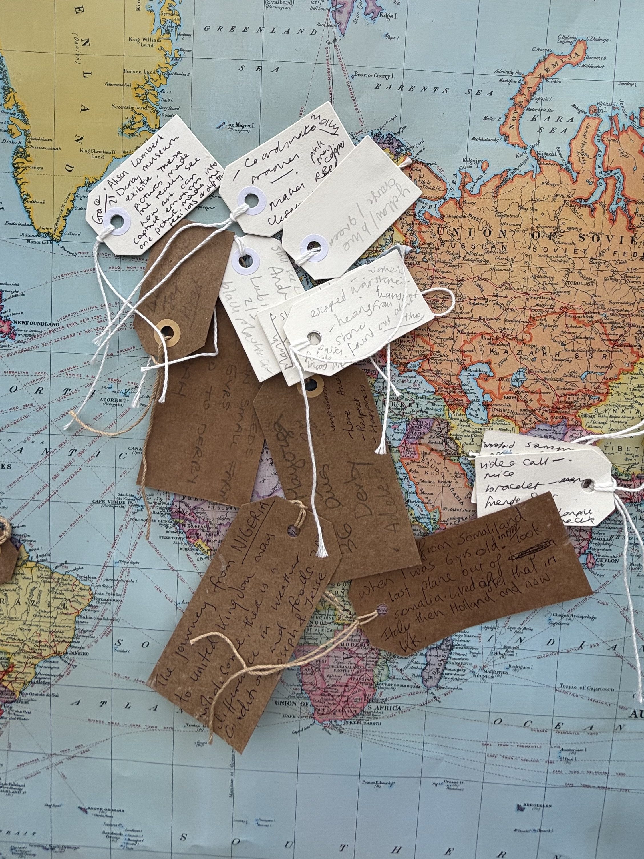 Over 2 days I spoke with over 50 people, most of whom had lived in multiple homes and places, all sharing experiences or perspectives on migration, prompted by the audio stories. Over 2 days, many tags accumulated on our world map, reflecting the diversity of the audiences/ passers by who engaged with the project.